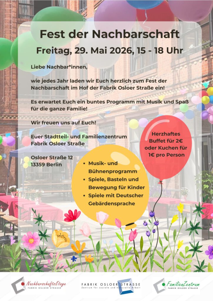 Wo: Familienzentrum Fabrik Osloer Straße, Osloer Str.12, 2. Hof, Aufgang B, 1.OG, Treffpunkt Nachbarschaftsetage und Veranstaltungssaal