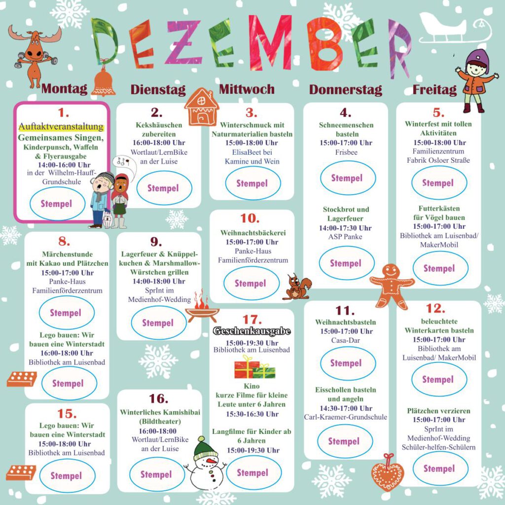 Für jedes besuchte „Türchen“ gibt es einen Stempel – ab 3 Stempeln gibt es ein kleines Geschenk, das ihr bei der Geschenkeausgabe am 17.12. zwischen 15 und 19:30 Uhr bei der Bibliothek am Luisenbad aussuchen könnt.