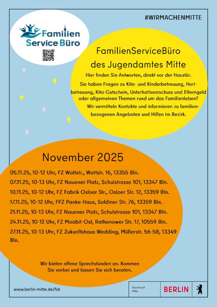 Einmal im Monat kommt das Familienservicebüro des Jugendamtes Mitte ins FamilienZentrum Fabrik Osloer Straße. Ohne Anmeldung und kostenlos berät das Familienservicebüro bei Fragen zu Kita- und Kinderbetreuung, Hortbetreuung, Kita-Gutschein, Unterhaltsvorschuss und Elterngeld oder zu allgemeinen Themen rund um das Familienleben.