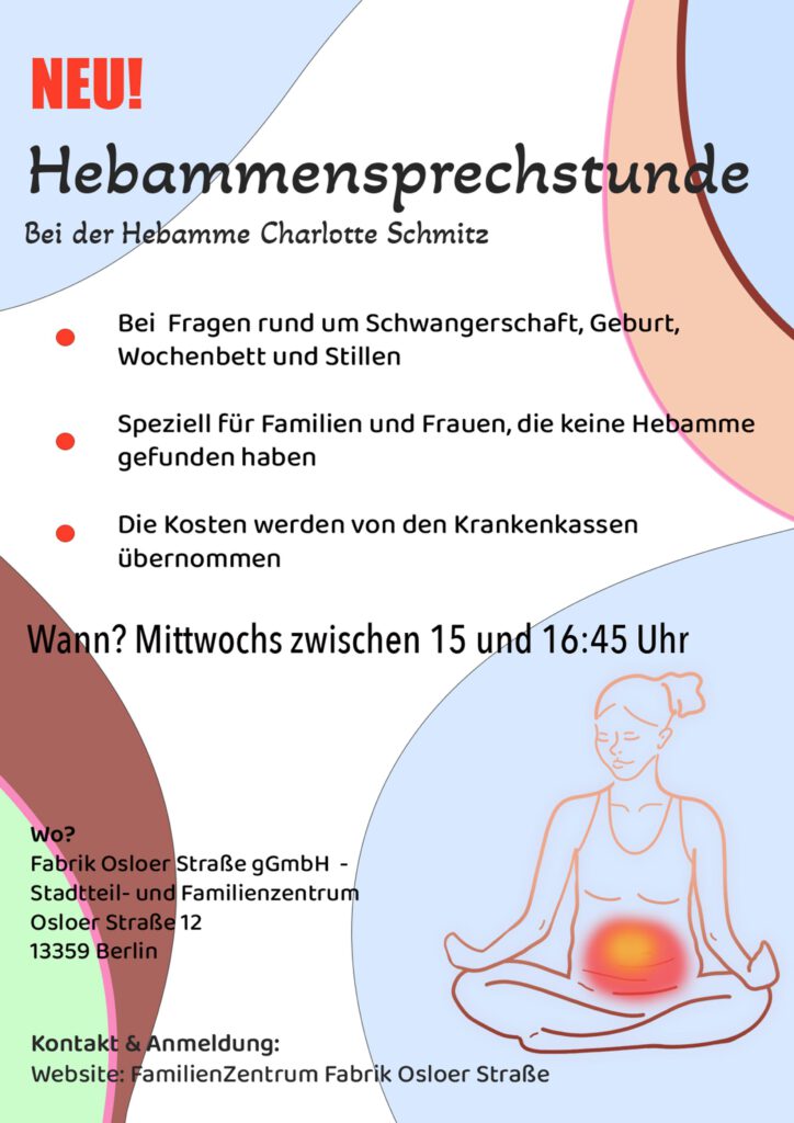 *Die Sprechstunde kann keine Hebammenbetreuung ersetzen, sondern ist als kurzfristige Hilfestellung und Beratung für Frauen und Familien gedacht, die keine sie betreuende Hebamme haben, oder deren Hebamme verhindert oder im Urlaub ist.