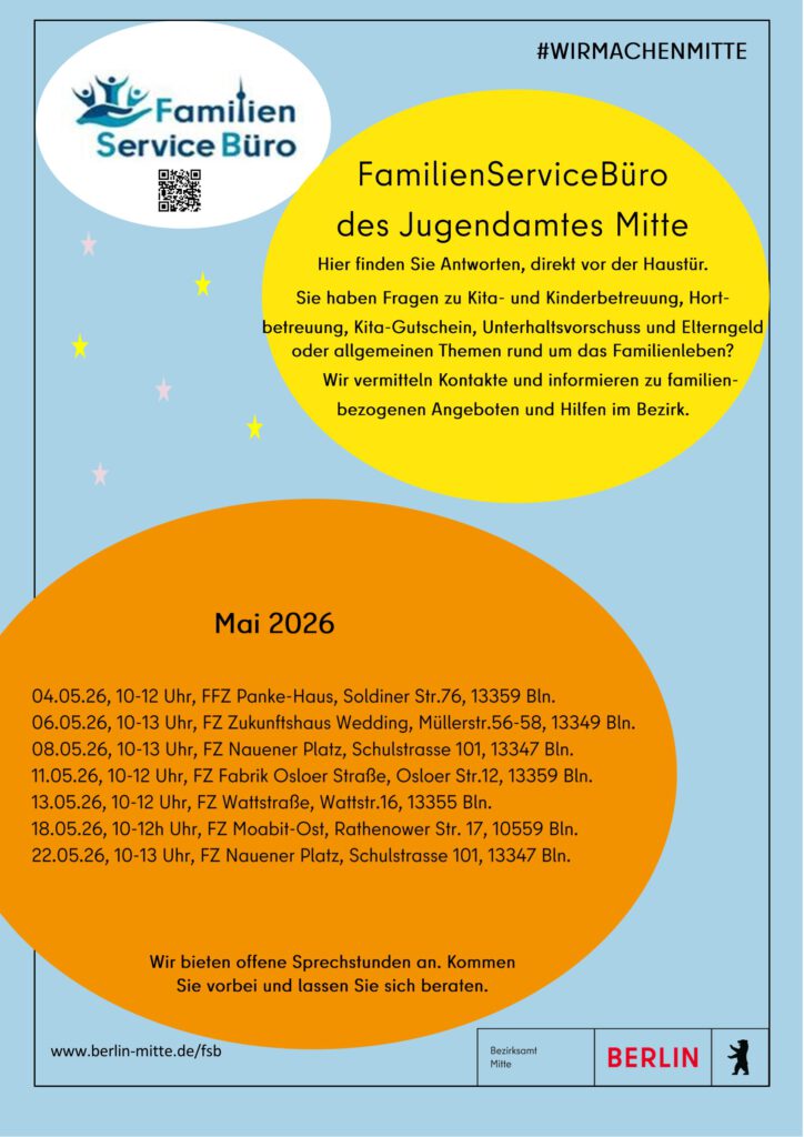 Das Bezirksamt Mitte fördert mit dem Programm Berliner Familienzentren die sozialräumlich ausgerichtete Entwicklung von Familienzentren, um die Infrastruktur für Familien mit Kindern zu verbessern. Weitere Informationen finden Sie hier. Von 2014 bis Ende 2025 wurde das Familienzentrum Fabrik Osloer Straße gGmbH durch die Senatsverwaltung für Bildung, Jugend und Familie gefördert.