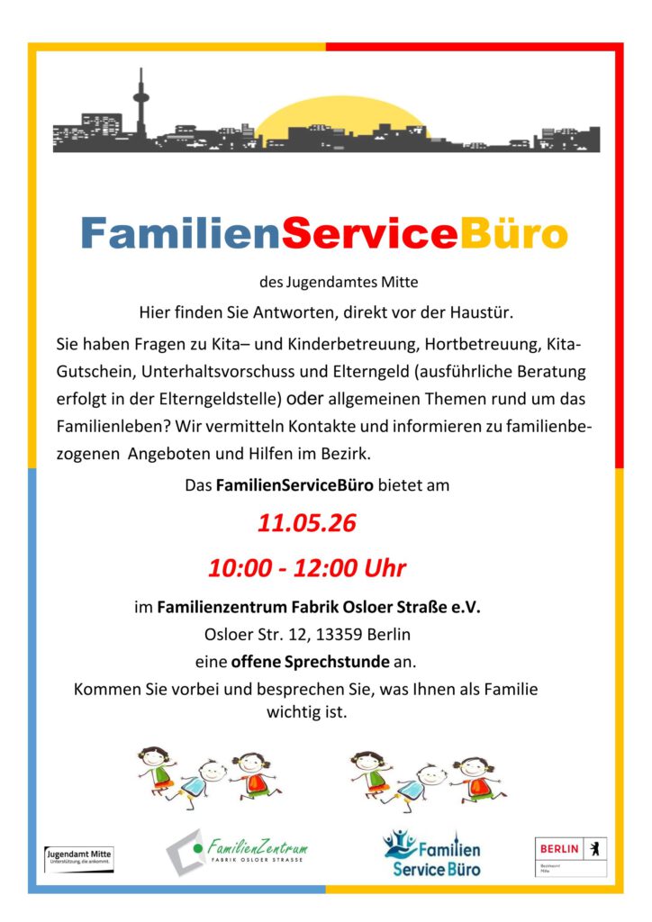 Das Bezirksamt Mitte fördert mit dem Programm Berliner Familienzentren die sozialräumlich ausgerichtete Entwicklung von Familienzentren, um die Infrastruktur für Familien mit Kindern zu verbessern. Weitere Informationen finden Sie hier. Von 2014 bis Ende 2025 wurde das Familienzentrum Fabrik Osloer Straße gGmbH durch die Senatsverwaltung für Bildung, Jugend und Familie gefördert.